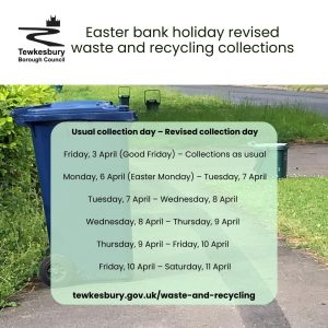 Friday, 3 April (Good Friday) will be collected as usual. For Monday, 6 April (Easter Monday) and throughout the week collections will be a day later than usual.
